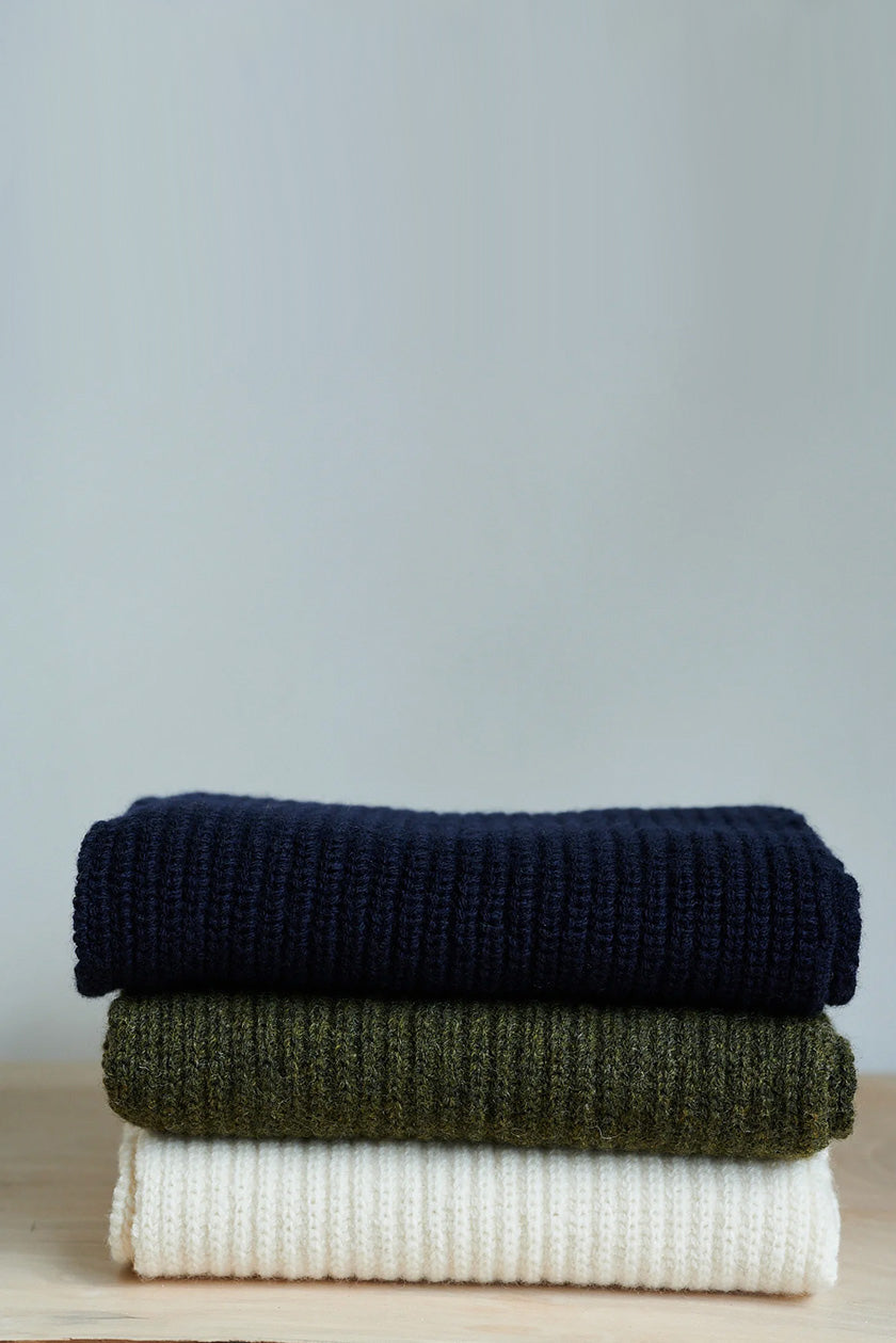 A fisherman knit scarf with made with 5% cashmere and 95% British lambswool blend. Perfect to wrap up with on these colder days. It's not too wide so it can be wrapped around and stuffed into a coat or a jacket without feeling too bulky. We like to wear ours tied in a knot which sits perfectly around the collar of a coat or jacket and keeps the cold air out.