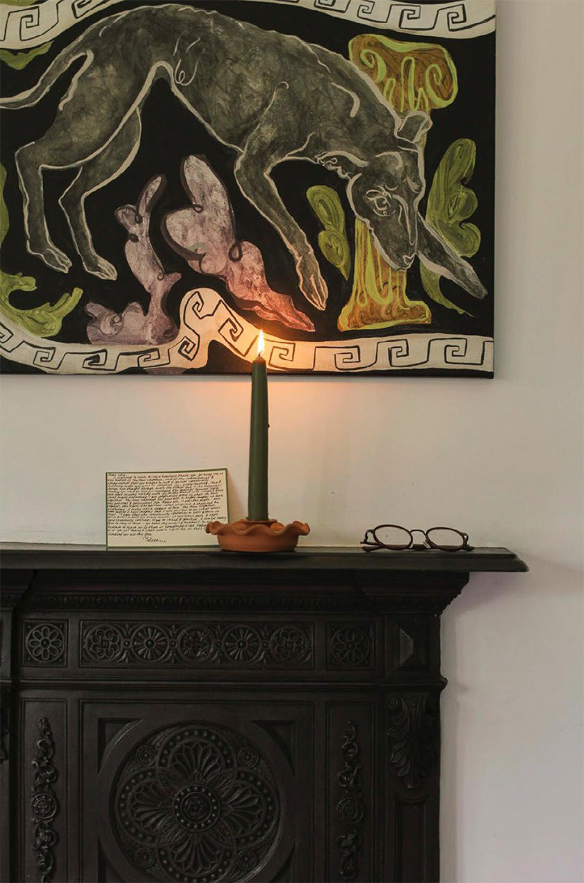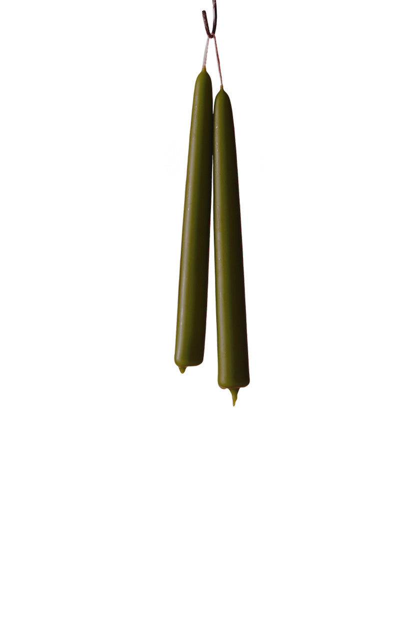 A pair of hand-dipped beeswax tapered candles available in a grounded and warm green tone. When lit this candle releases a subtle aroma. Made from 100% pure beeswax with a cotton wick, natural materials of honey, green tea and orange peel provide their natural subtle scent.